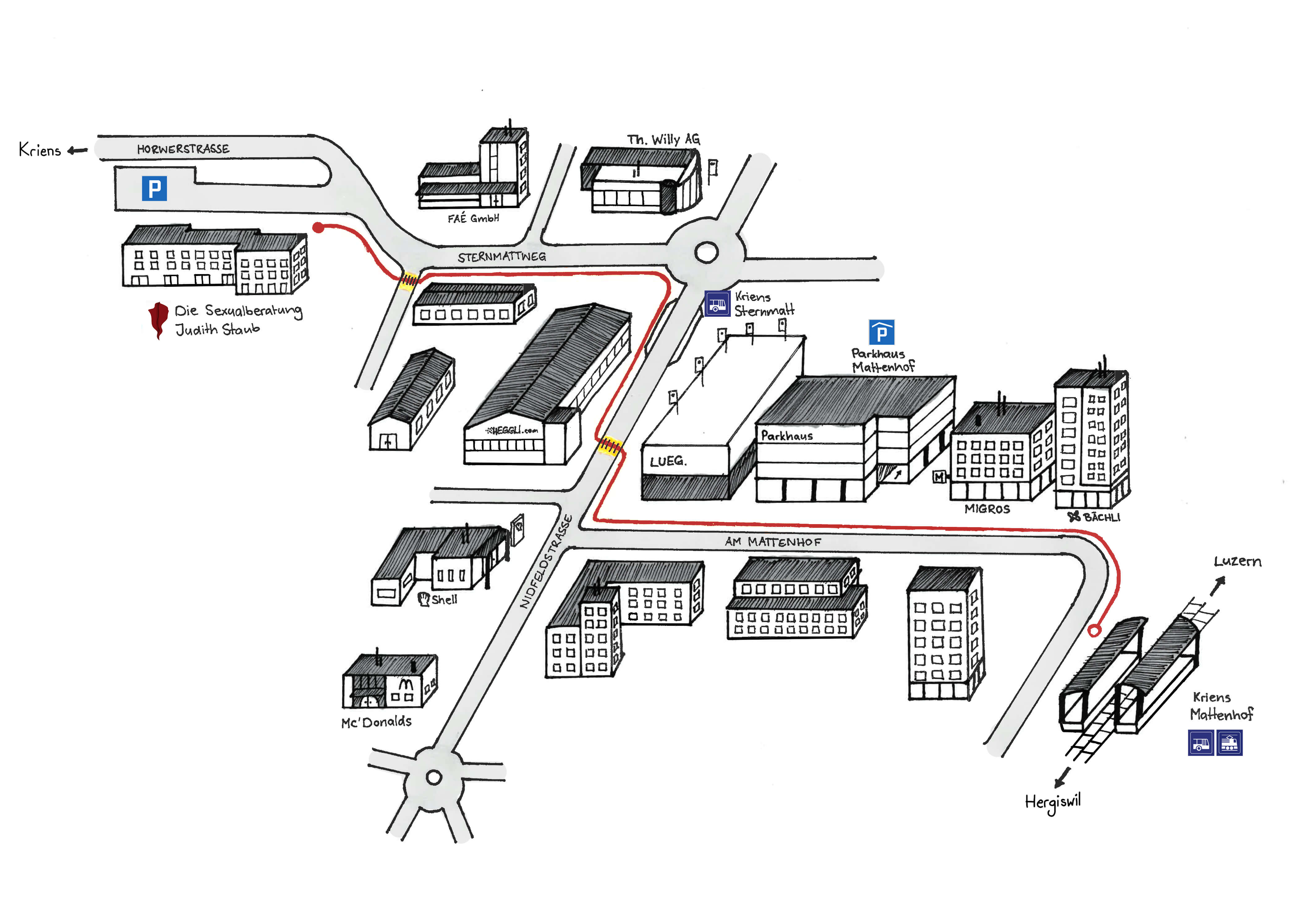 Zu Fuss von Bahnhof Mattenhof (Zum Vergössern klicken) :